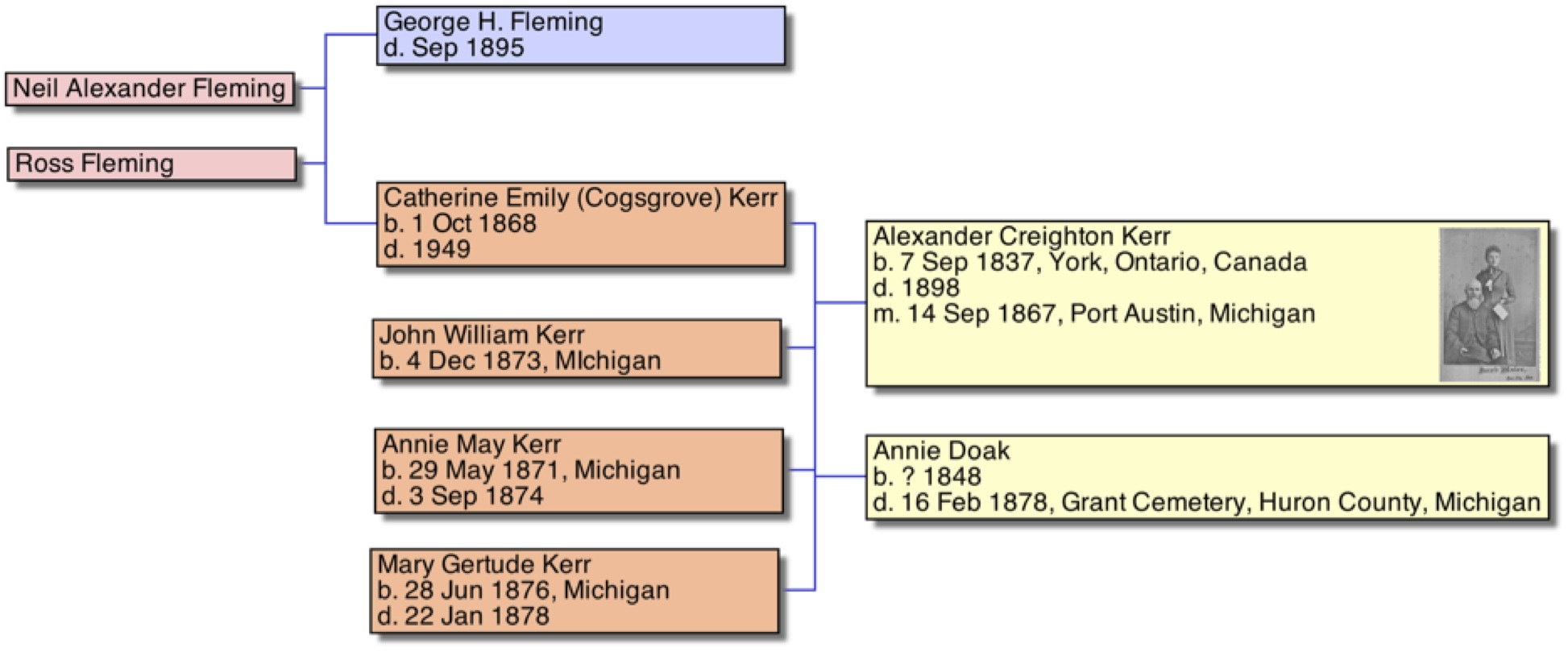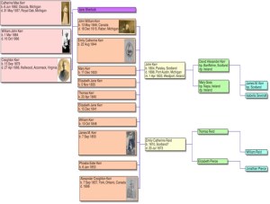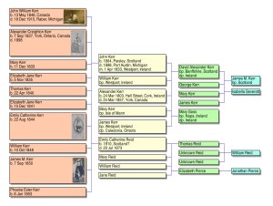 The graphic below shows the first four known generations of our Kerr clan.  You can click on it to see a larger version. The two family lines I have the most information about is for the brothers John William Kerr, my ancestor, and Alexander Creighton Kerr. Those two family charts appear further down with the descriptions of those families.
