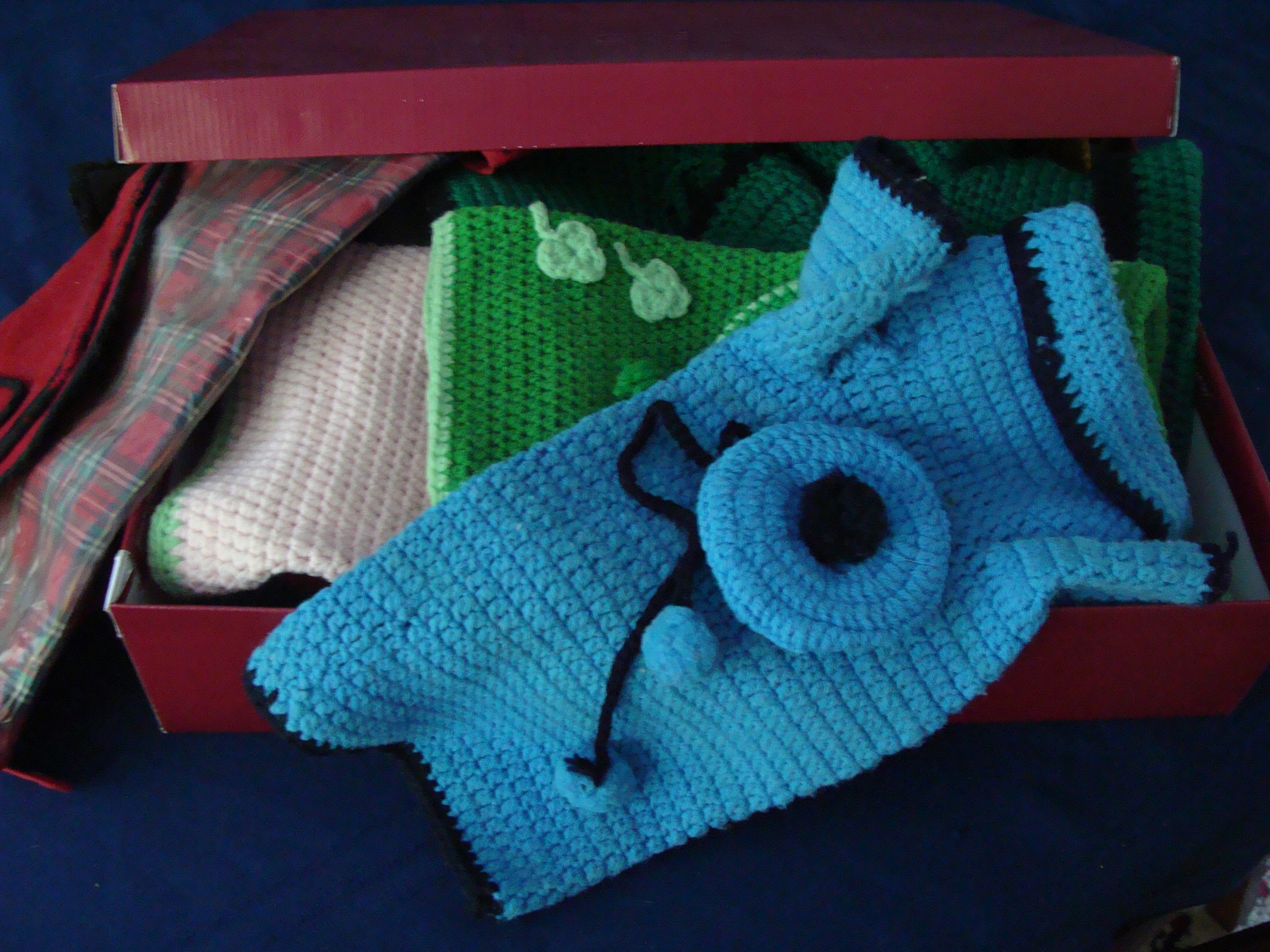 Ten years went by, and I came across the box tucked away in a back corner under the rafters. What was difficult to figure out years before, the obvious choice now seemed clear. Since our kitties did not choose to wear the outfits, I donated the coats to the Animal Coalition of Delaware County, an organization dedicated to finding places for homeless animals.