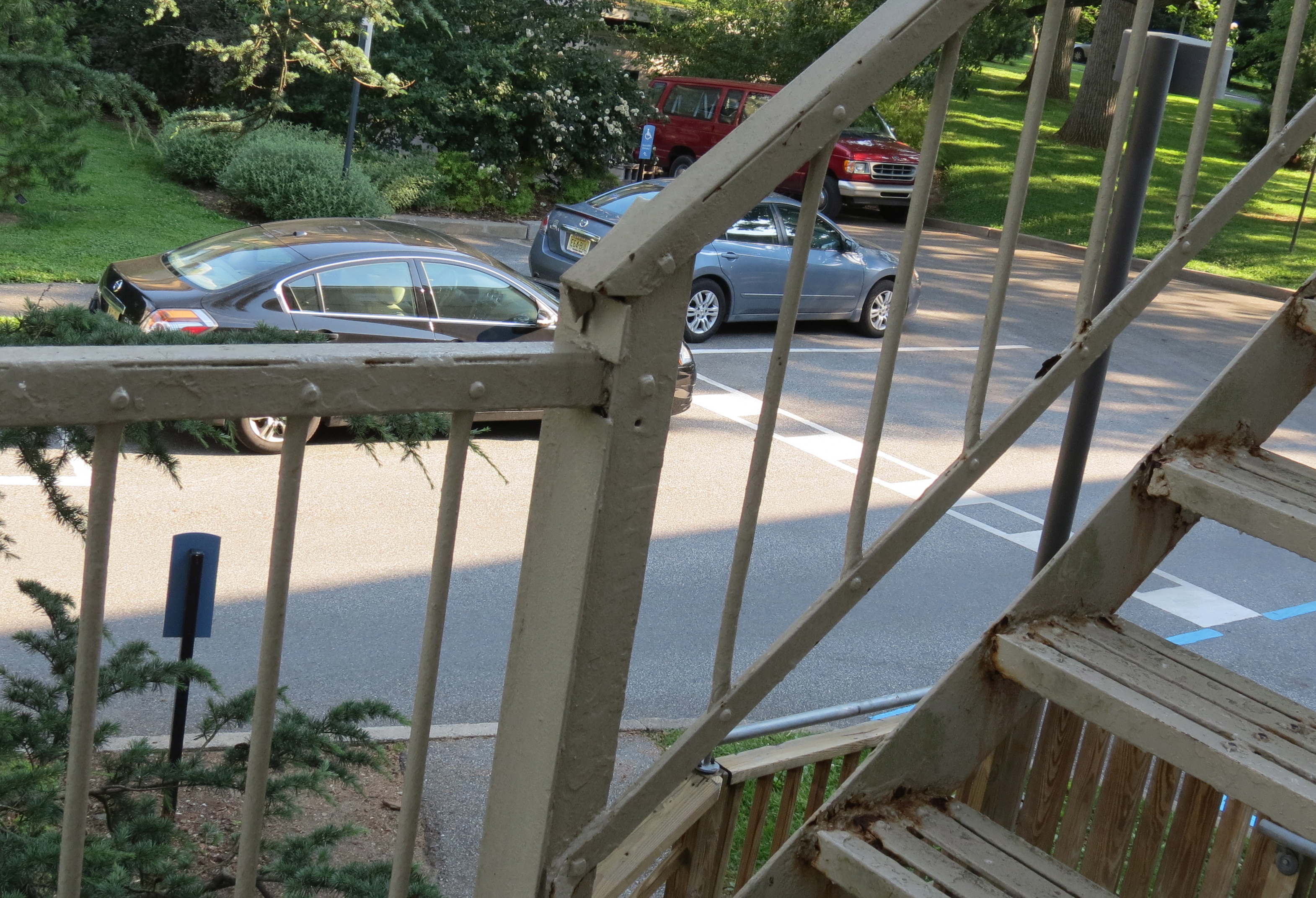 On the second morning, she was back flitting between a nearby tree and the railing. The night before I checked my bird book and identified her as a House Wren, with her turned up tail and warbling tweetie song. I thought she must have a nest somewhere. I looked in the tree and scanned the walls of the building to see if twigs might be sticking out from a light fixture or downspout, but no such signs appeared.