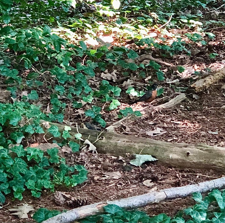 I’m familiar with the tweets of robins, especially, their warning chirps, which are strong steady beacons that warn of danger nearby. What I heard in the forest was a quieter version of that warning sound but still steady. A robin flew on a log just a short distance to where I placed the little one. The robin continued her vigil with her mournful single note, flying over her baby from one side to the other.