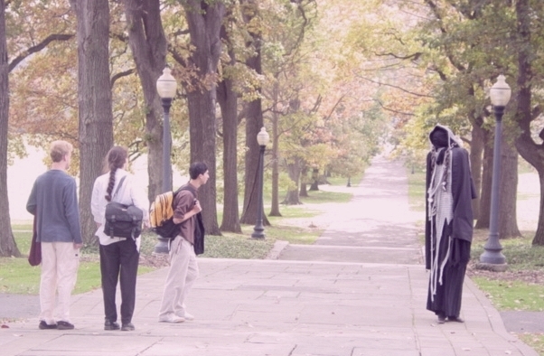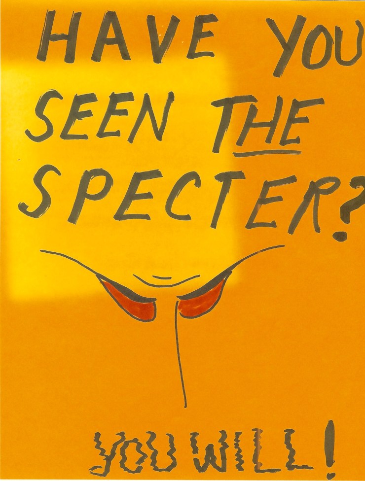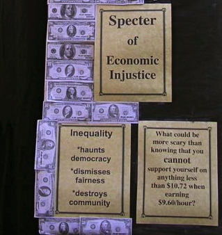 During our years working on the Swarthmore College Living Wage and Democracy Campaign we used many venues, such as panels, rallies and lectures to advance the cause of a living wage for campus workers. For some of these events we incorporated street theater as one of the methods to bring attention to low wages at the College. Around Halloween in October of 2004 the Specter of Economic Injustice began wandering about the campus and town. Signs warned that the Specter was coming: