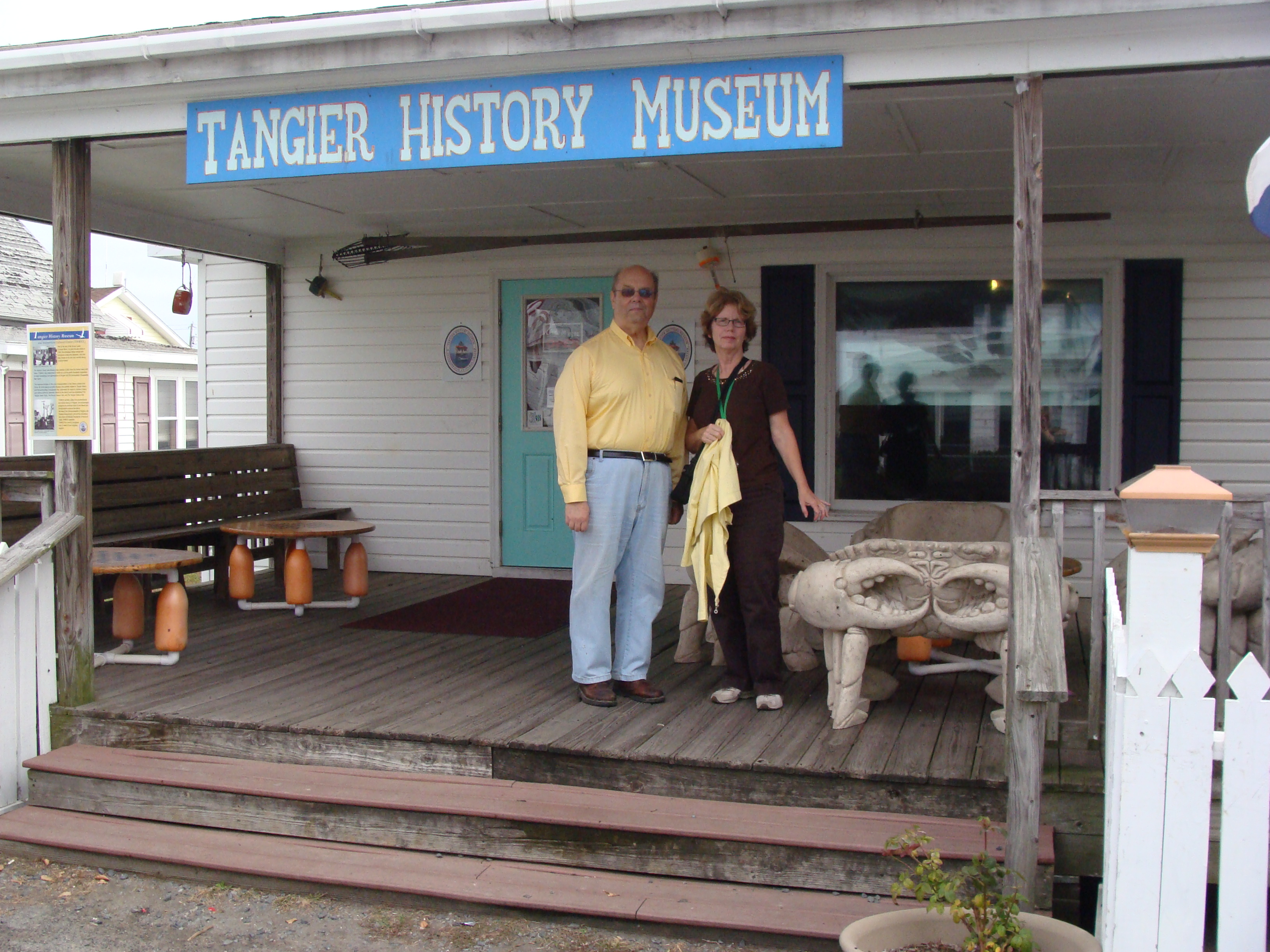 The next morning we set out to explore the island. We rode to the airport area and through the streets of the main village. We paused to watch the snowy egrets fishing in the marshes. We stopped for supper at Hilda Crockett’s Chesapeake House. A family-style meal, we had plenty to eat with homemade hot bread, corn pudding, crab cakes and oyster fritters, just to name a few of the total nine dishes served. Afterward, we stopped at the Tangier History Museum, viewed the exhibits and saw a short movie.