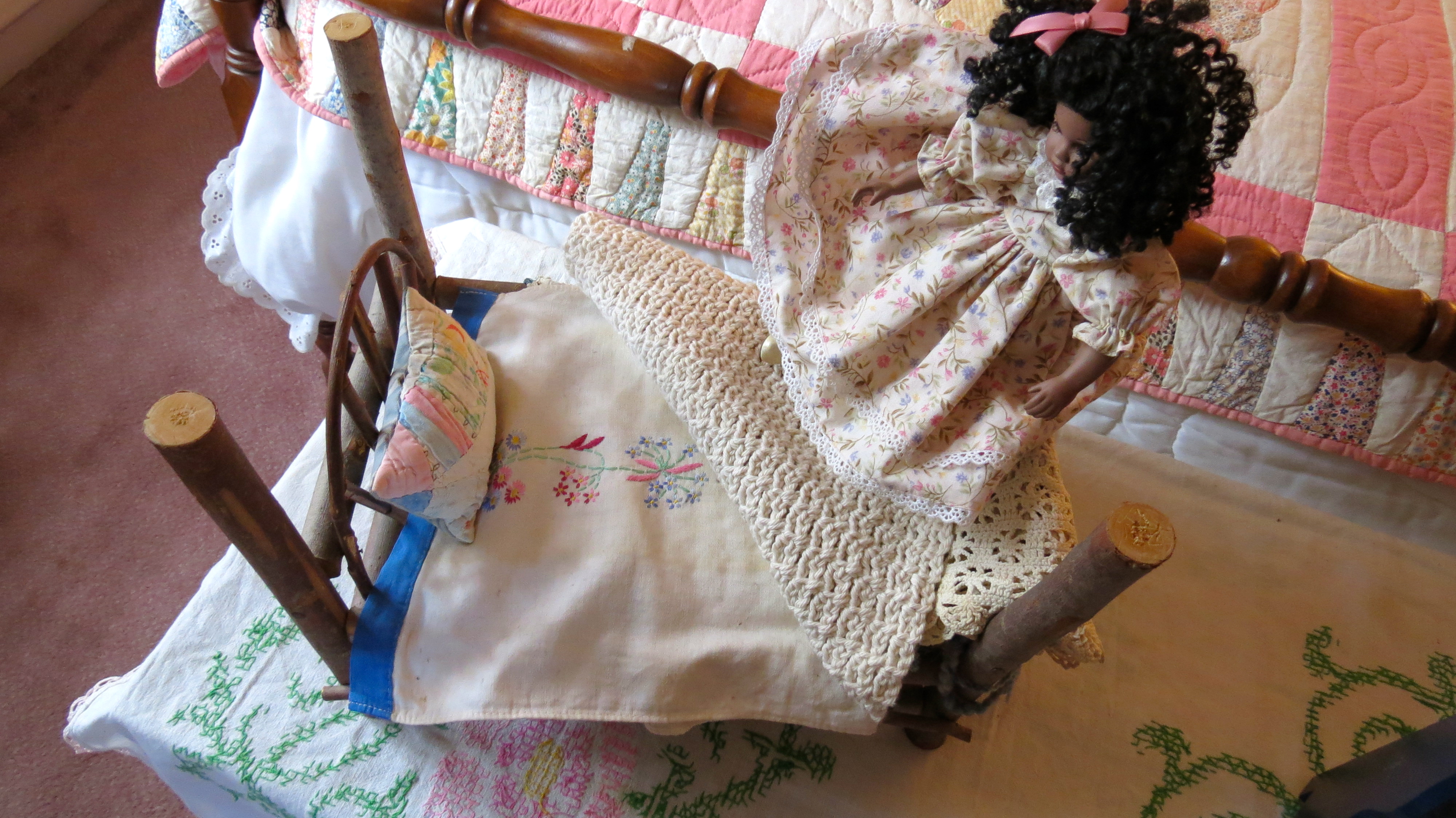 Solution:  I decided to go “shabby chic” with our guest room.  I bought furniture at thrift shops and resurrected some pieces from the attic. The doilies and quilts worked well in the room. I carefully washed the sheets and pillowcases and put them on the bed. I used some of the smaller pieces as blankets in a doll’s bed.