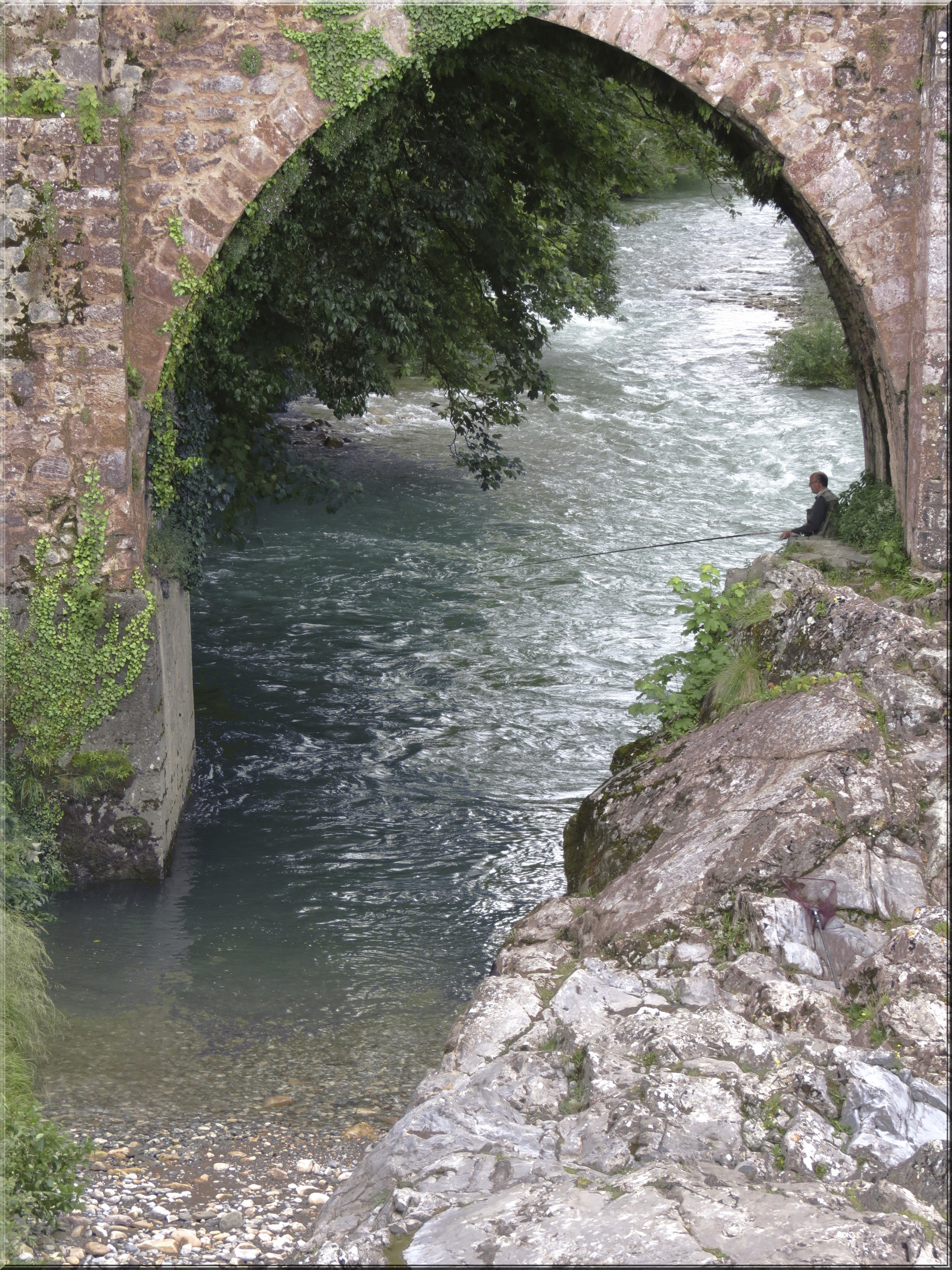 By the time the bus zigzagged back down the mountain, my head was throbbing. We stopped for lunch in the little town of Cangas de Onis, the former capital of the Kingdom of Asturia. A Roman bridge spans the Sella River, where fishermen cast their lines from the rocks below. After lunch, we were on our own to wander through the town, at which point I somehow got turned around and lost and had to be rescued by Carlos, our tour bus driver. I blame my confusion on the residual instability in my head from the trip down the mountain.