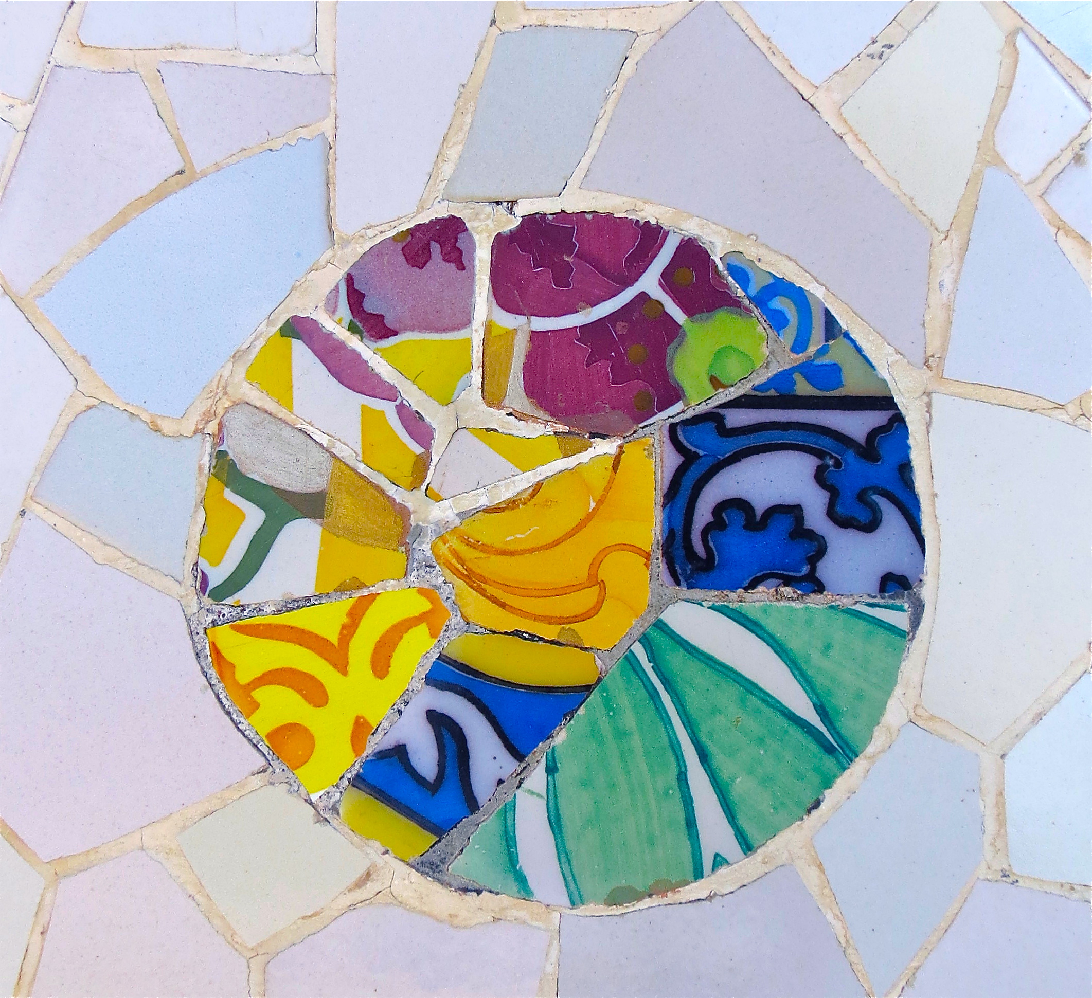 Is a masterpiece of architectural creativity. I overheard someone say, “It’s a bit over the top.” What? There is no top for this creation. This is one of those places where you can’t stop photographing, and you just don’t know which way to look next to take it all in. The structures reminded me of my sculpting clay class. It seems as if Antoni Gaudi, Catalan architect of this garden village, was making pottery, but on a larger scale, of course. Gaudi designed curved benches, which were inlaid with ceramic pieces of pottery. This undulating form outlined a large plaza, which on the far end we could view the sea.