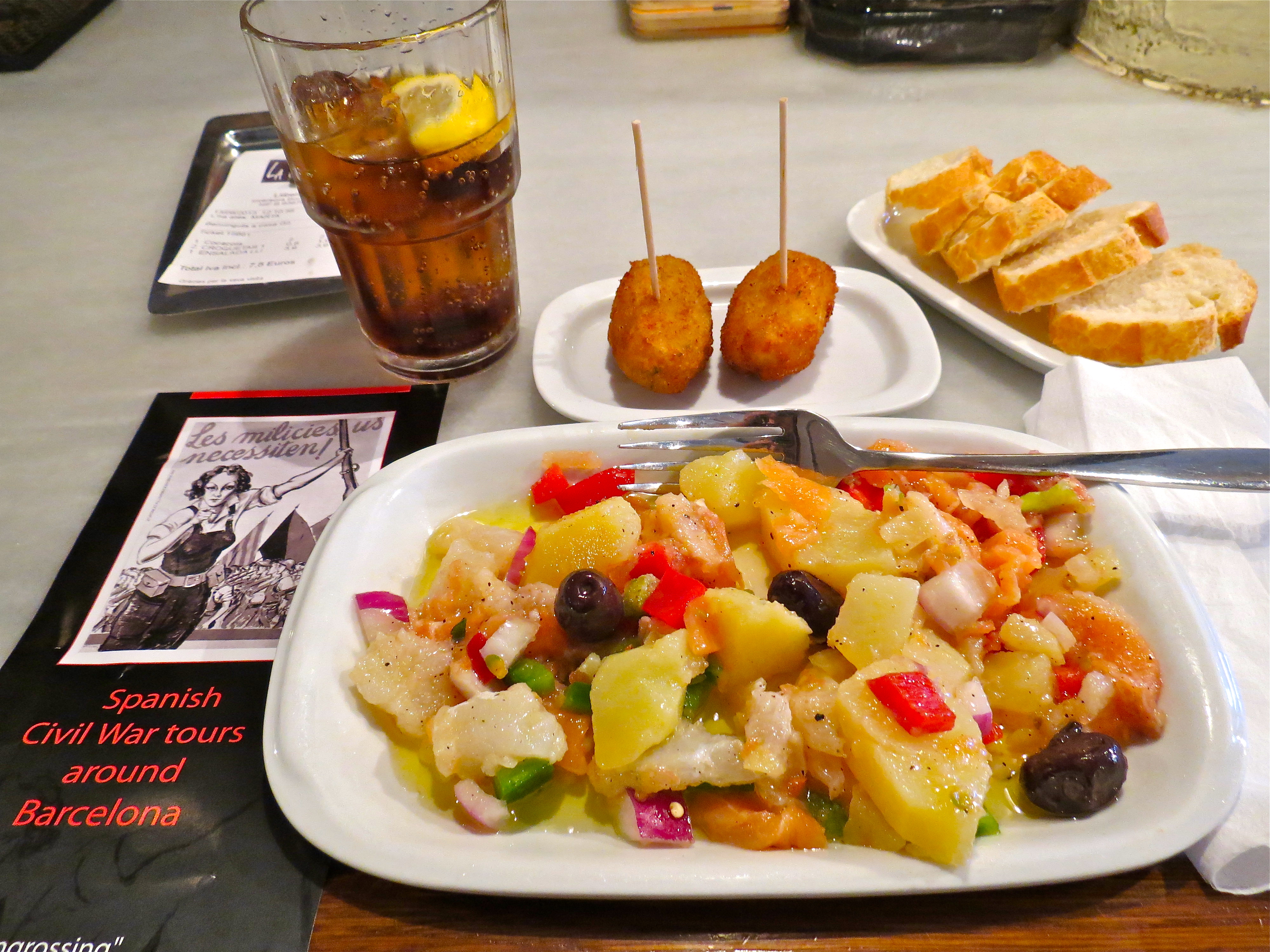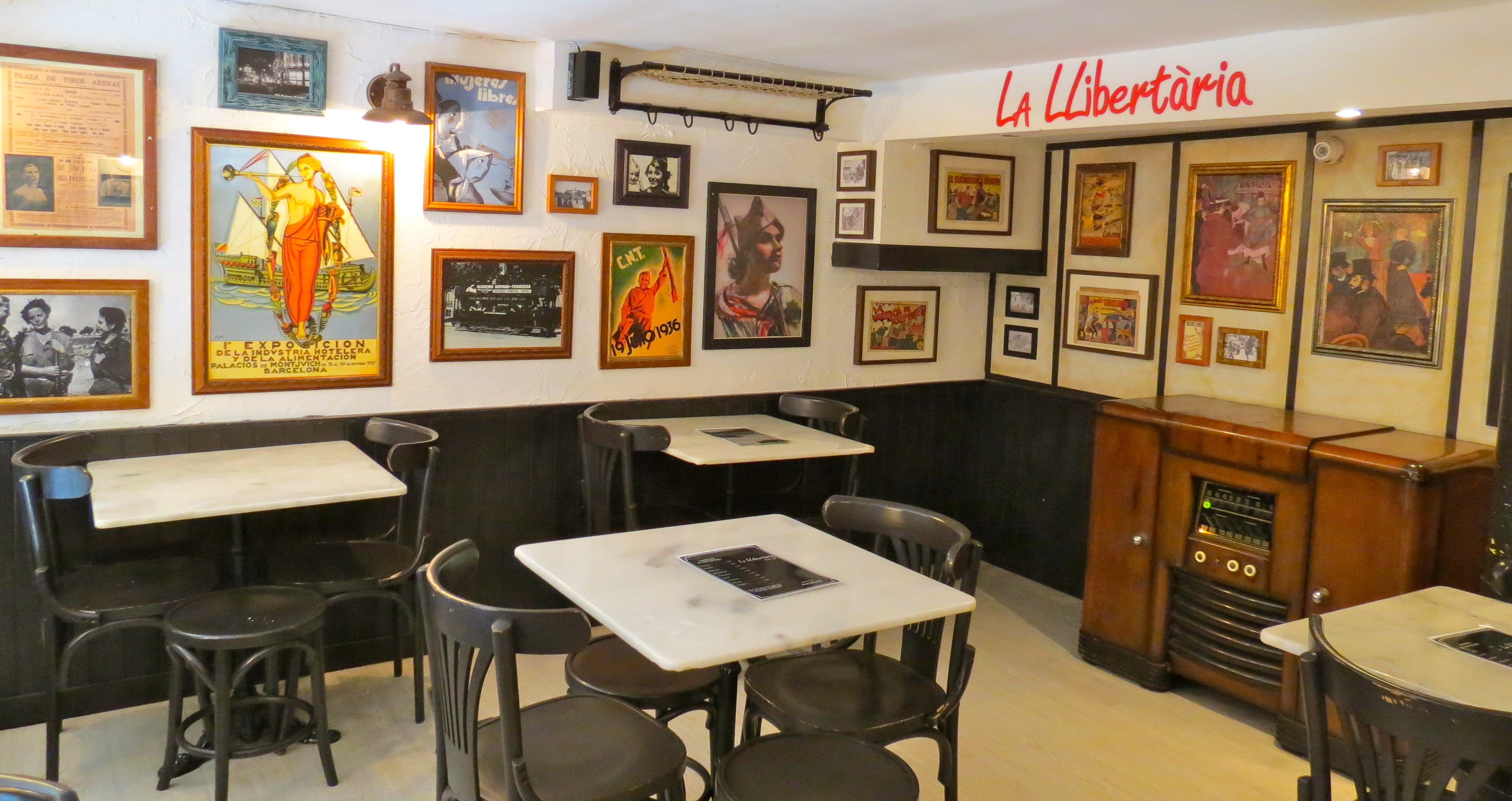 Lunch: LaLlibertarai, Tallers Street, 48, 08001. The rustic bar just off Las Ramblas. Walls are decorated with posters and photographs displaying the anarchist history in Barcelona and the Spanish Civil War.