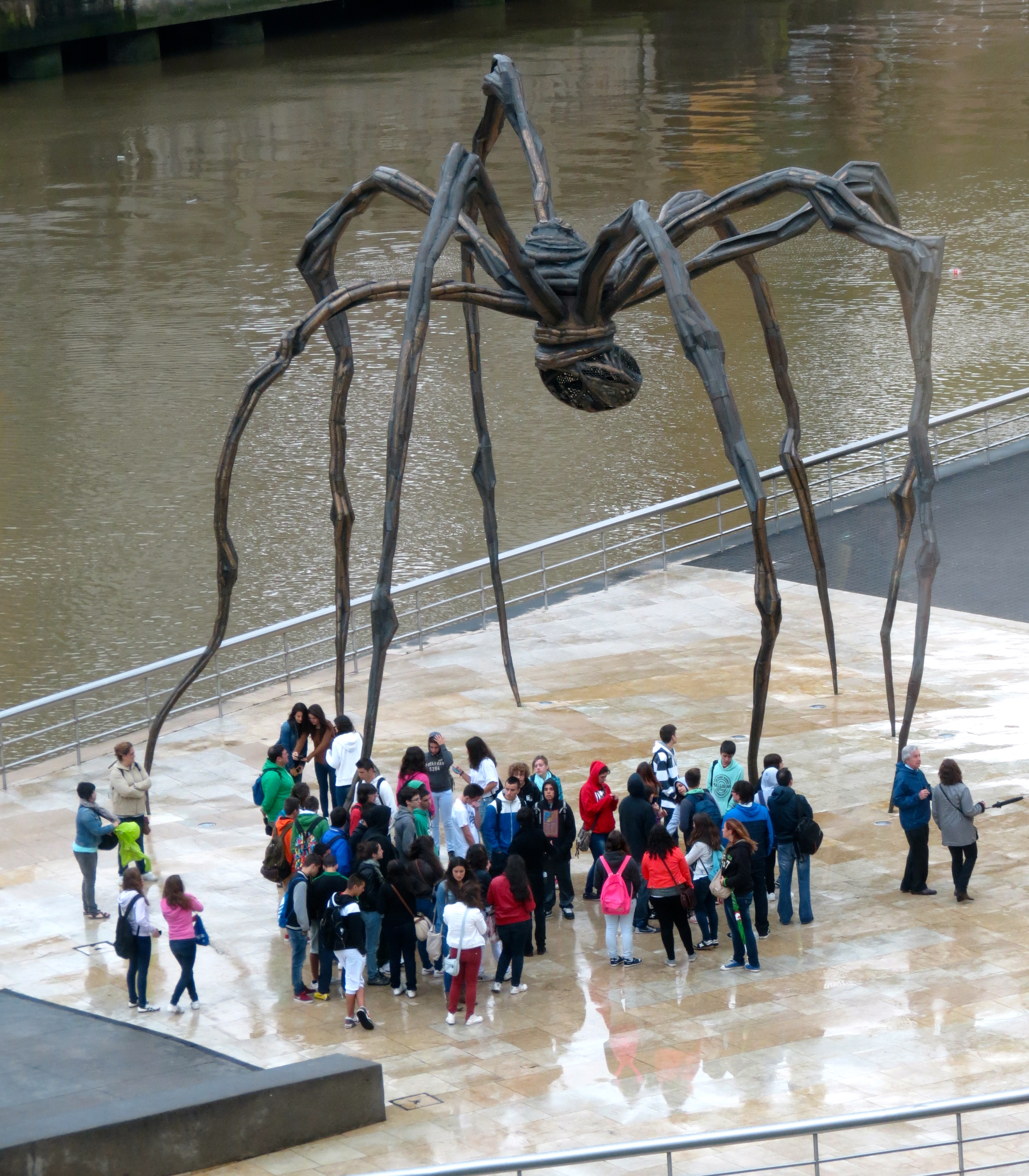 I returned to the outside of the museum to take pictures of two contrasting art pieces: the huge dog, entitled “Puppy,” covered in colorful flowers and the equally as gigantic spindly spider, which reminded me of the nursery spider I found in my garden.