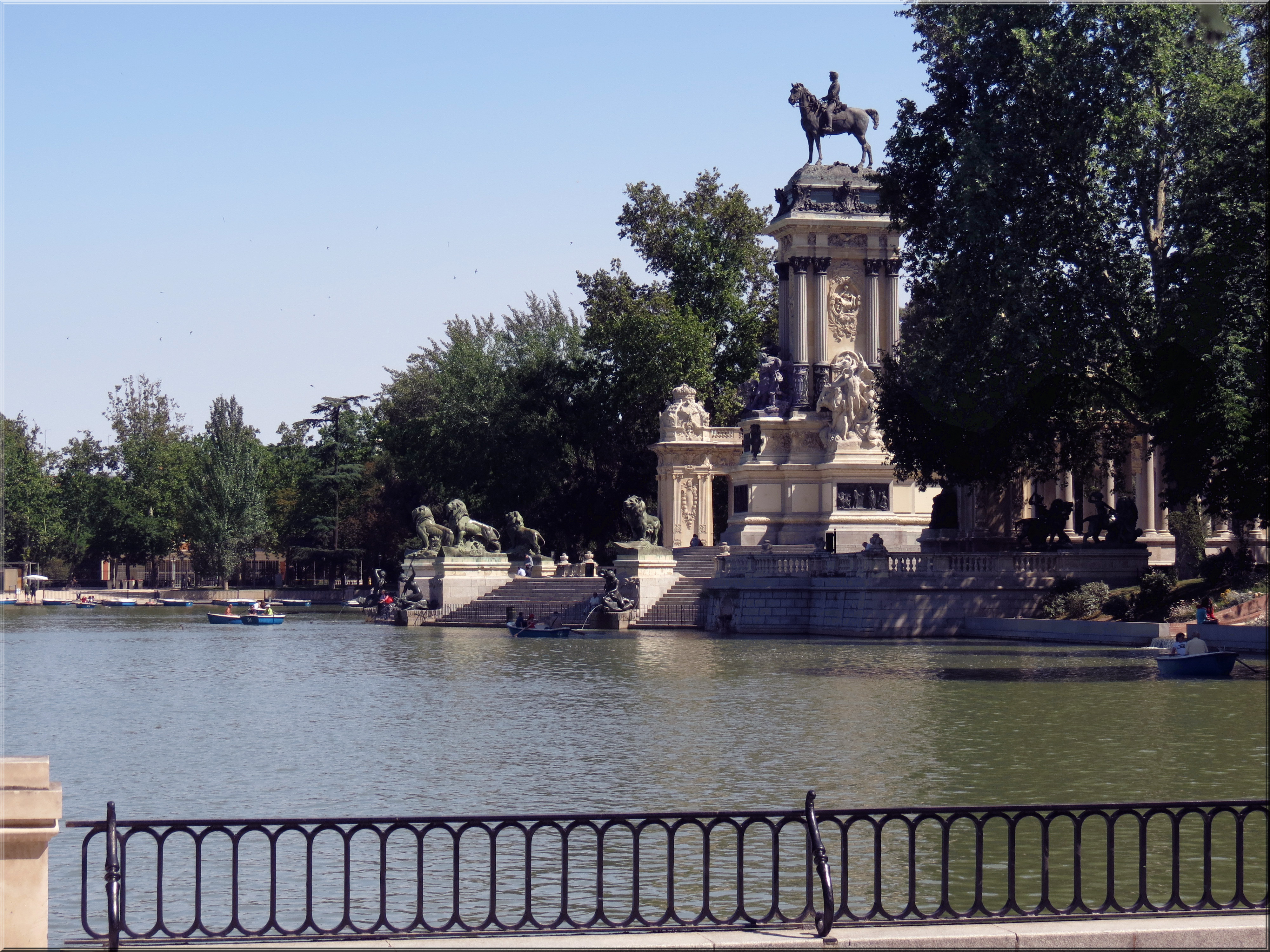 Once upon a time, only royalty was permitted in this park until the 18th century when Charles III opened it even to us commoners! The center of the park is a lake where visitors can rent rowboats. Children tossed bread crumbs into the water to feed the carp that splashed at the surface, some diving out of the water in excitement. The carp compete with sparrows, ducks, and pigeons for the cast-offs. An impressive monument surrounded by a semi-circle of columns stood on one side of the lake. In the shady areas, a spicy fragrance spilled from the trees. The horseman on the top is Alfonso XI, unfortunately, restored to the monarchy after trying to establish a republic in Spain.