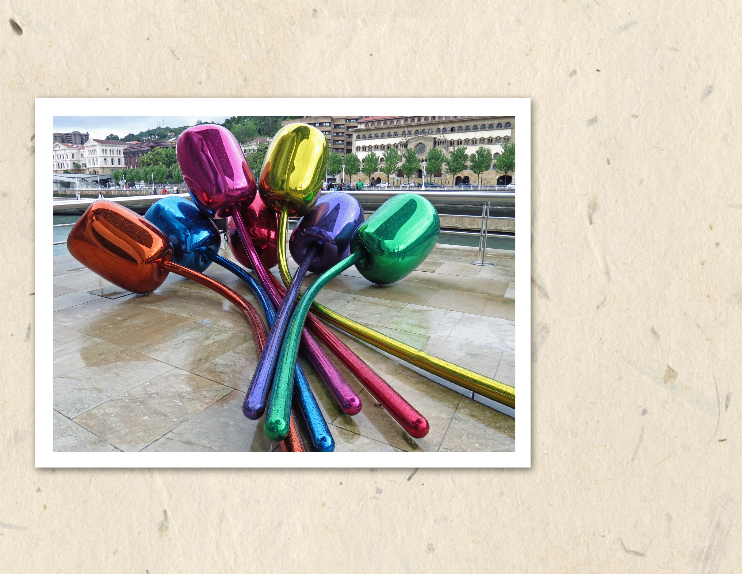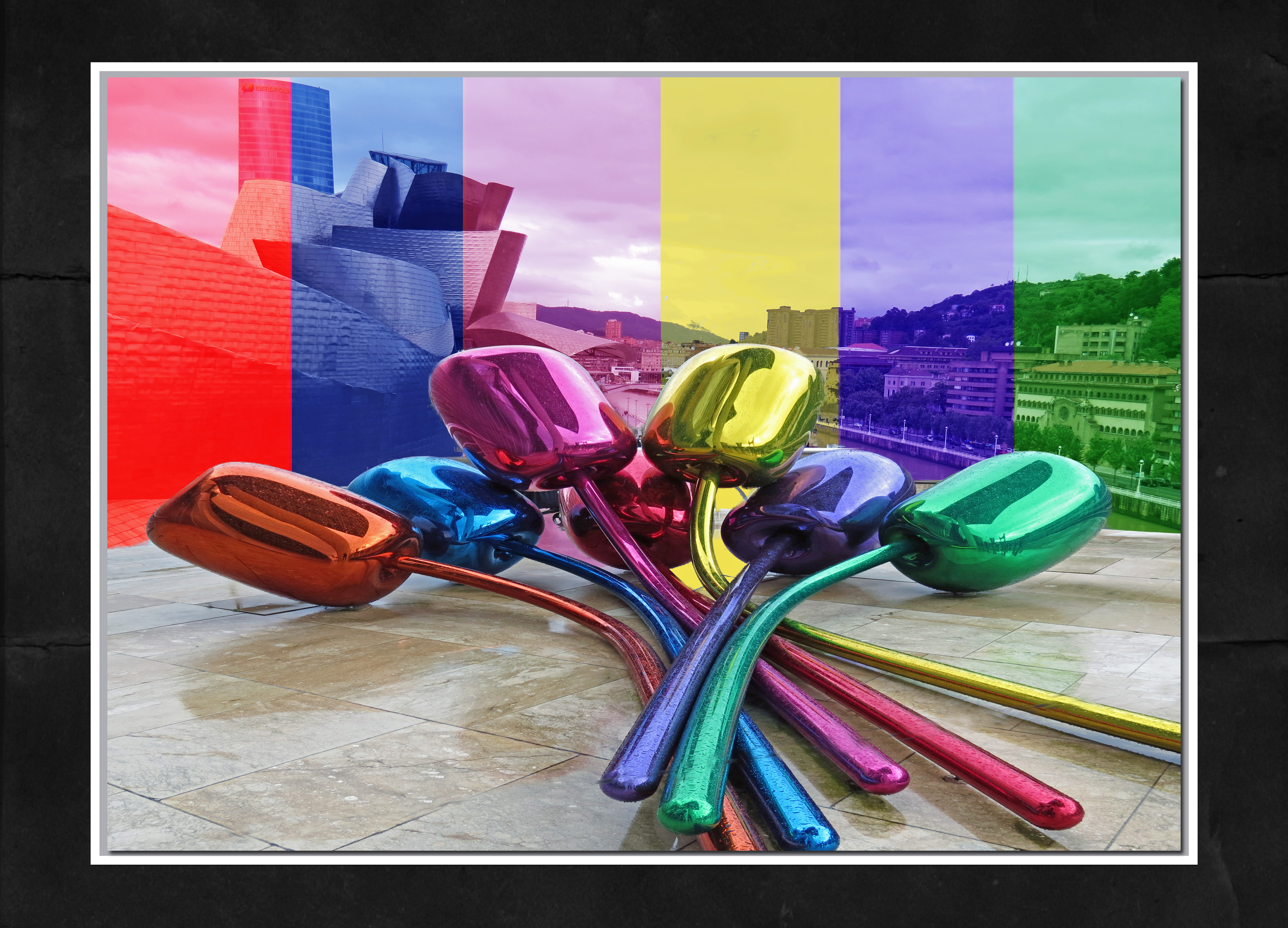 (On return home . . . . having fun doing photographic collages. . . here the Guggenheim Museum and outdoor sculpture, “Tulips”)