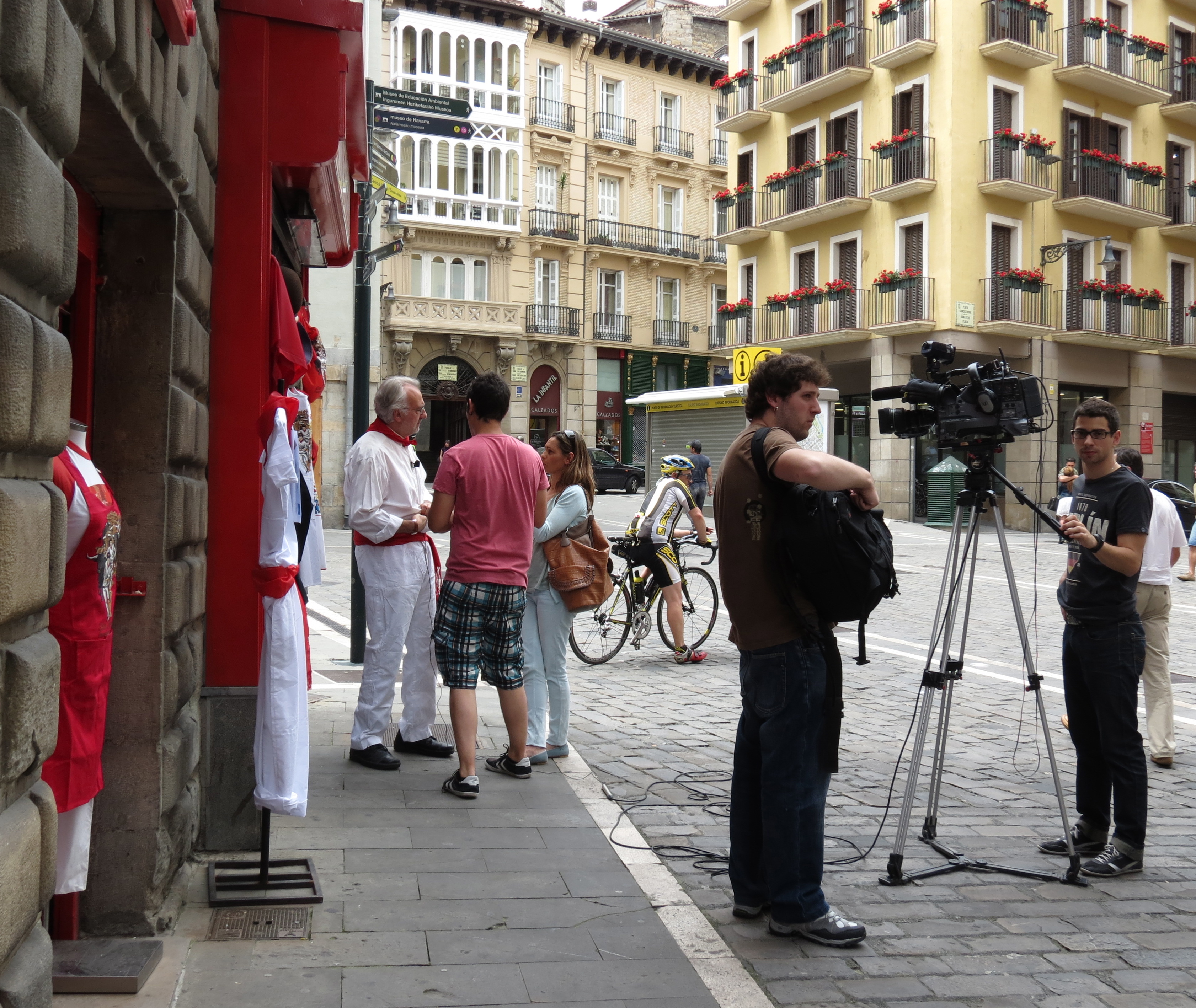 Camera crew getting ready to film the man in the white and red outfit, colors worn on the running of the bull event