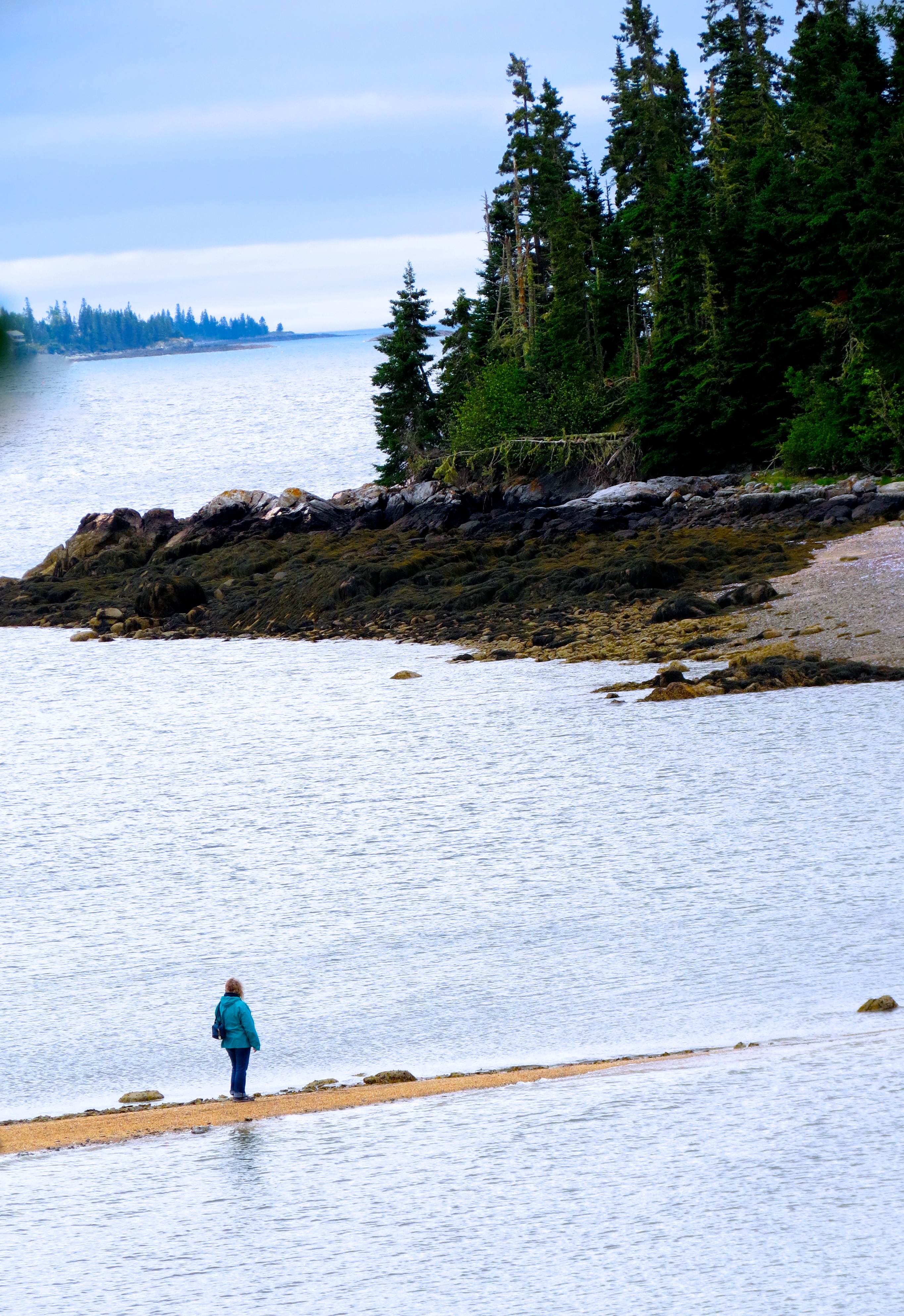 The crew rows passengers to the island, which looks like all the other islands, covered with evergreens, a rocky coastline, and a few sandy beaches. Folks immediately began combing the beach for shells and sea glass, while some of us take the path through the forest to an adjacent beach. As I brush against the low growing shrubs, the pungent aroma of spruce fills the air. I breathe deeply and think of Christmas. I wish I could just stay there except for those pesky mosquitoes and whatever else is flying around my head.