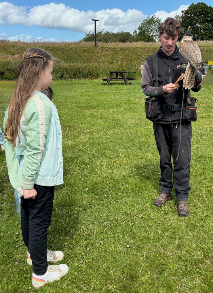 Steve then directed us to the flying field, a lawn surrounded by high grasses. He brought out a Harris Hawk and handling glove for us to wear.