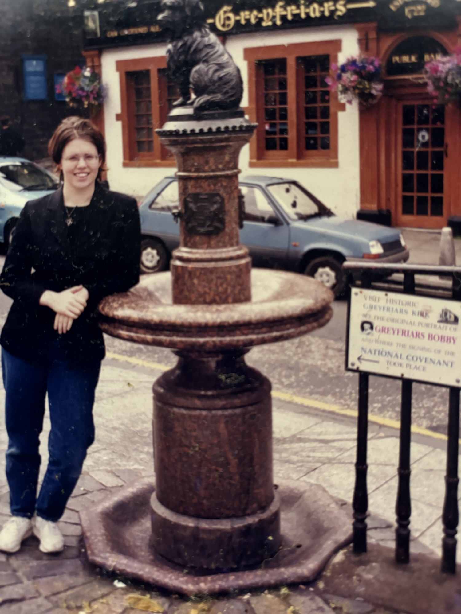 Mae standing next to Greyfriars Bobby statue in Edinburgh.