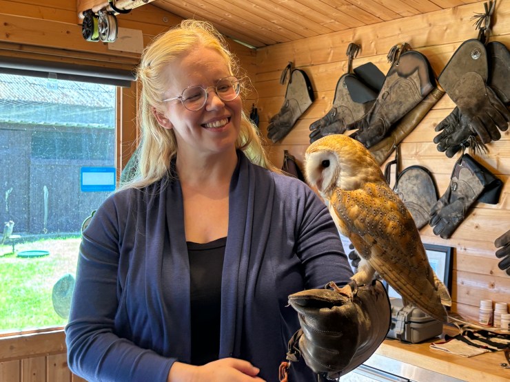 In preparation for meeting the birds, Steve guided us to his education classroom, a welcoming wood-paneled room with various handling gloves hanging on the wall. Steve covered many subjects including history of falconry and the training required for the birds to return after the hunt. The falconer even uses a special GPS system to track the birds, equipped with a transmitter. Steve introduced us to he first bird of prey, a very tame barn owl with soft feathers. We all had a change to hold the owl.