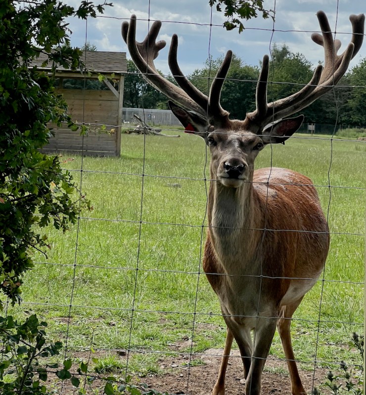 Wednesday asked if we could return one more time to feed the deer. On the other side of the path from the fawn feeding area, a magnificent and very large Red Deer stood looking at us on the other side of a tall wire fence.