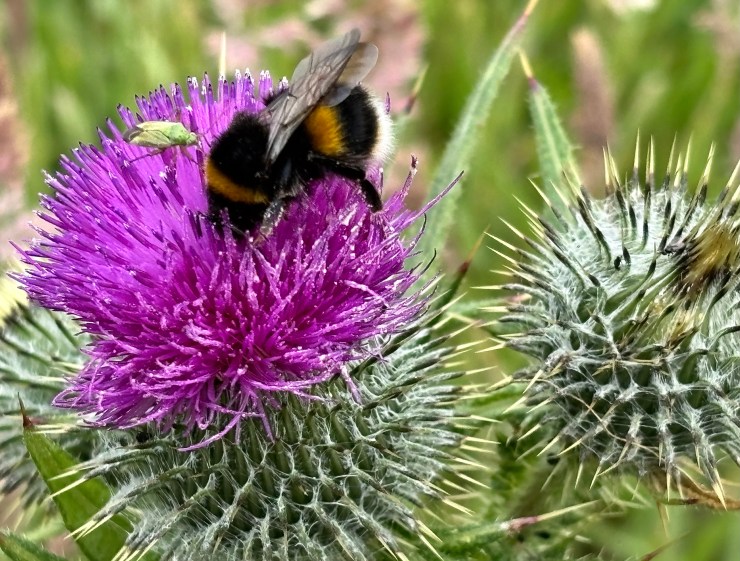 I am a gardener, spending time cultivating the spaces around the house. Last week, what mysteriously pops up on our property for the first time? A Plum Thistle!