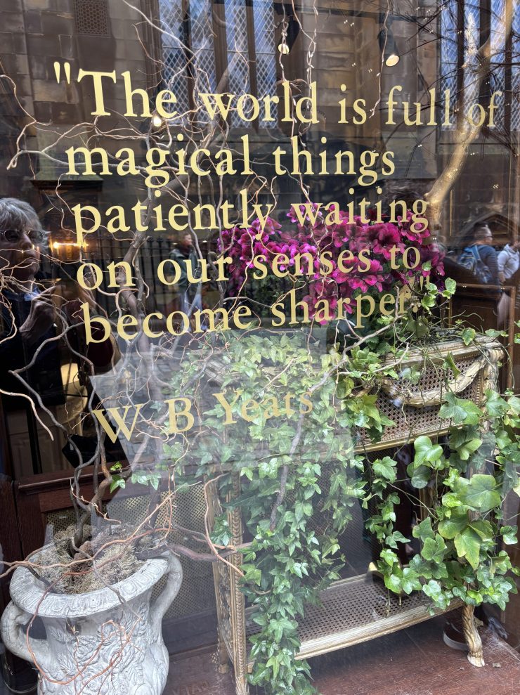 After lunch at the Greyfriars Pub, Mae, Wednesday and I headed over to a nearby art store. When we came out, Jean was standing in front of us with two sticks. Legends surround Bobby’s gravesite. Folks leave sticks for Bobby to fetch, or others say that your stick will reach the hand of heaven.