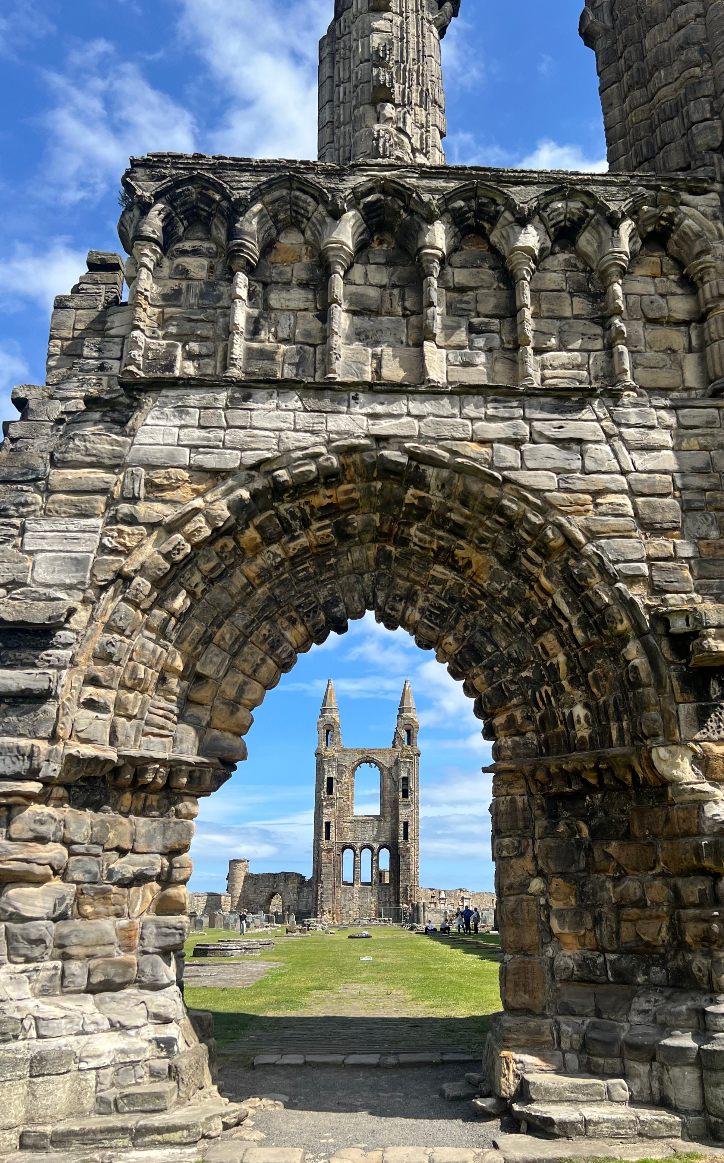 We read in a guidebook another must-see stop in St. Andrews had to include the Cathedral. I was expecting to see a building in a grand state, described as once the largest church in Scotland, but we were surprised that the structure was in total ruins. Dating back to the 12th-century, the Catholic Church built the structure. After the Reformation, the Cathedral fell into ruins when the locals sold the roof and used the stones for other construction projects. Folks say the cathedral is now the town. The massive size was striking even in its crumbling state.