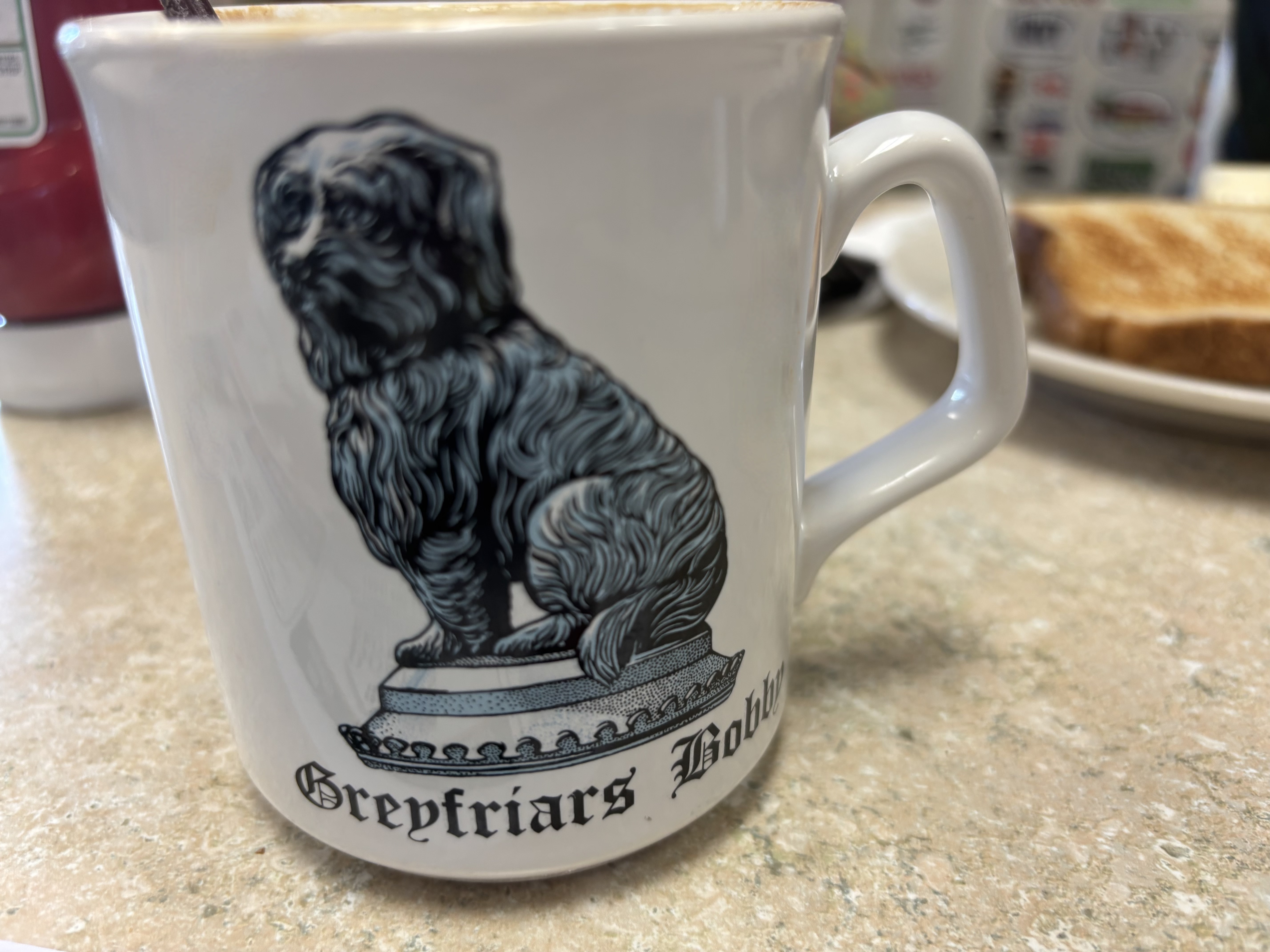 Why do I mention this story? The mysteries of life follow us, causing us to wonder. Several weeks ago we had breakfast at The Station, a small coffee shop that has a tradition of collecting an assortment of mugs from their customers, even offering free coffee if they donate mugs. What mug happens to turn up for Mae? Greyfriars Bobby!