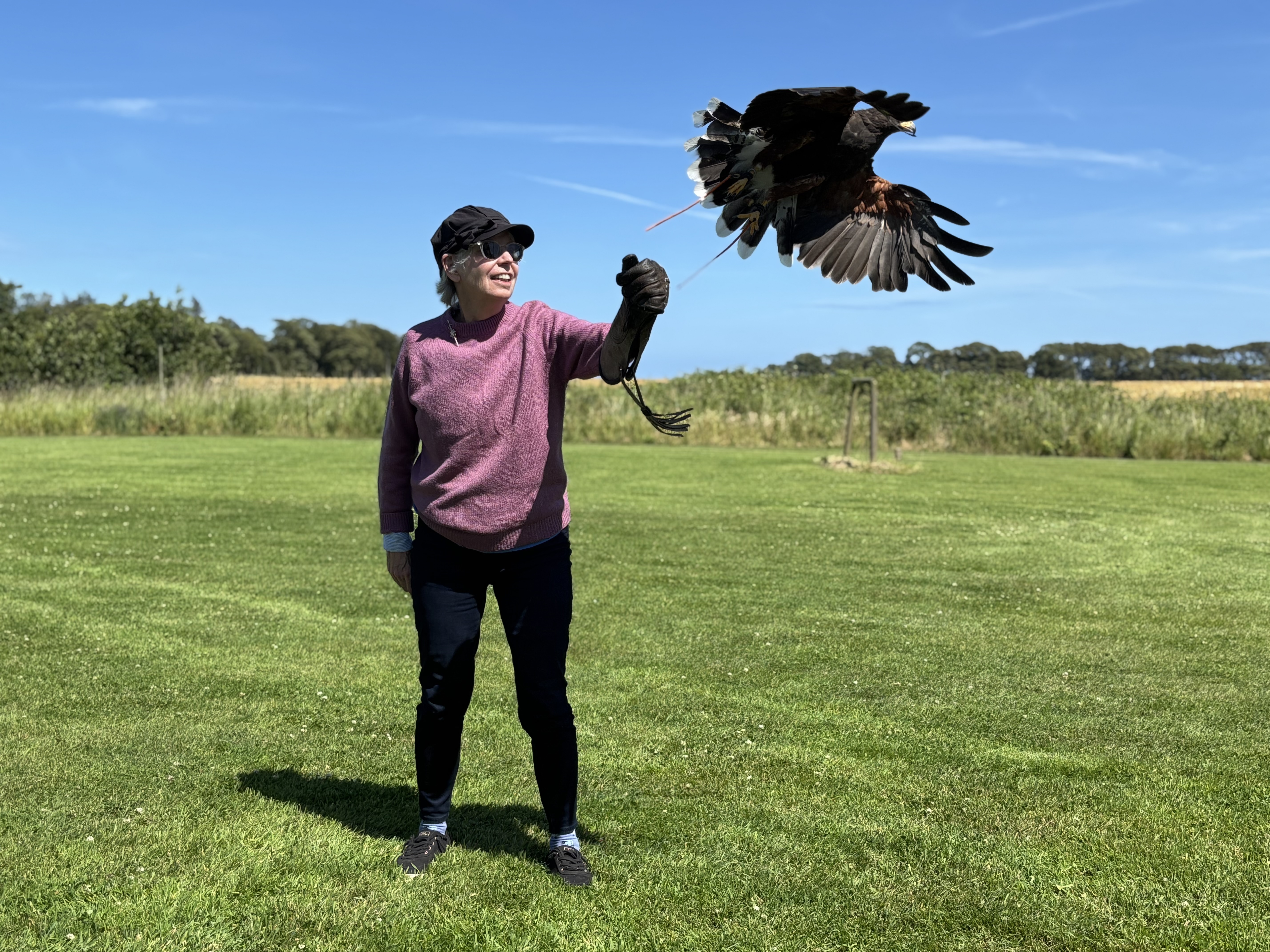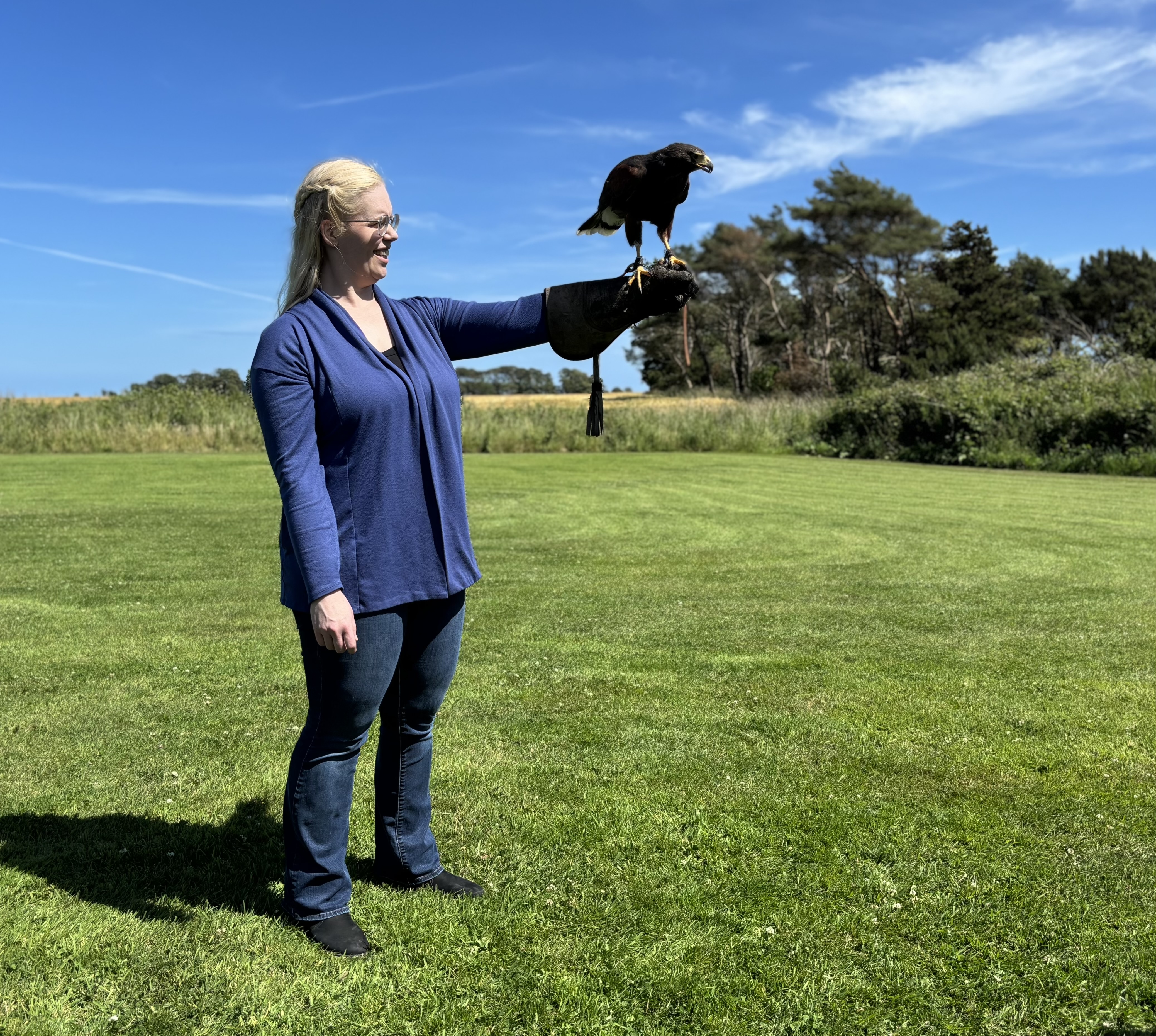 Steve then directed us to the flying field, a lawn surrounded by high grasses. He brought out a Harris Hawk and handling glove for us to wear.