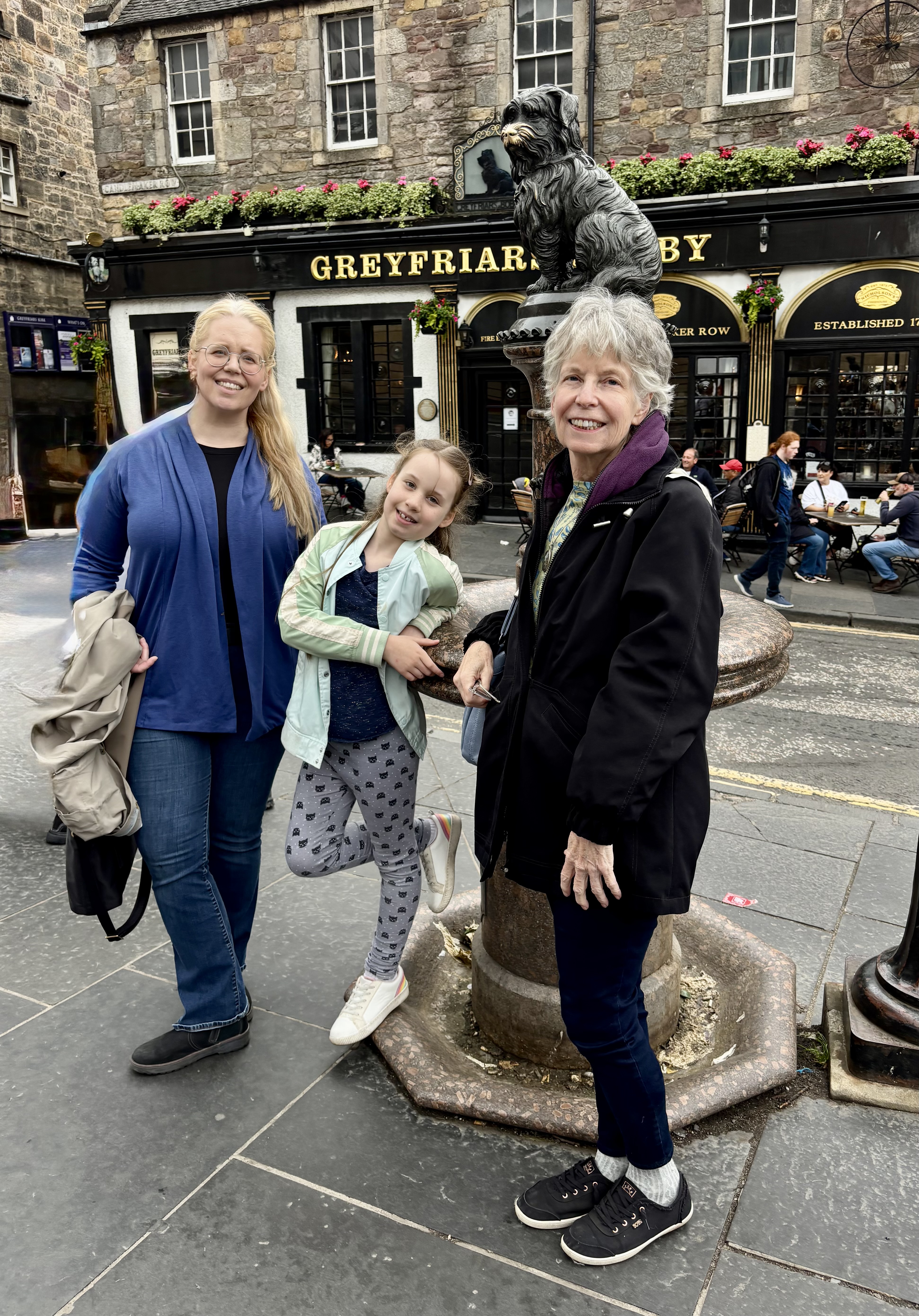 We set out to travel to the center of Edinburgh to take the “hop-on, hop off bus” for a tour through the city. Our first stop was the statue of Greyfriars Bobby to retake the photograph of Mae 26 years ago. Disney created a movie about this Skye Terrier, who is said to have stayed for over 14 years at the gravesite where his master was buried.