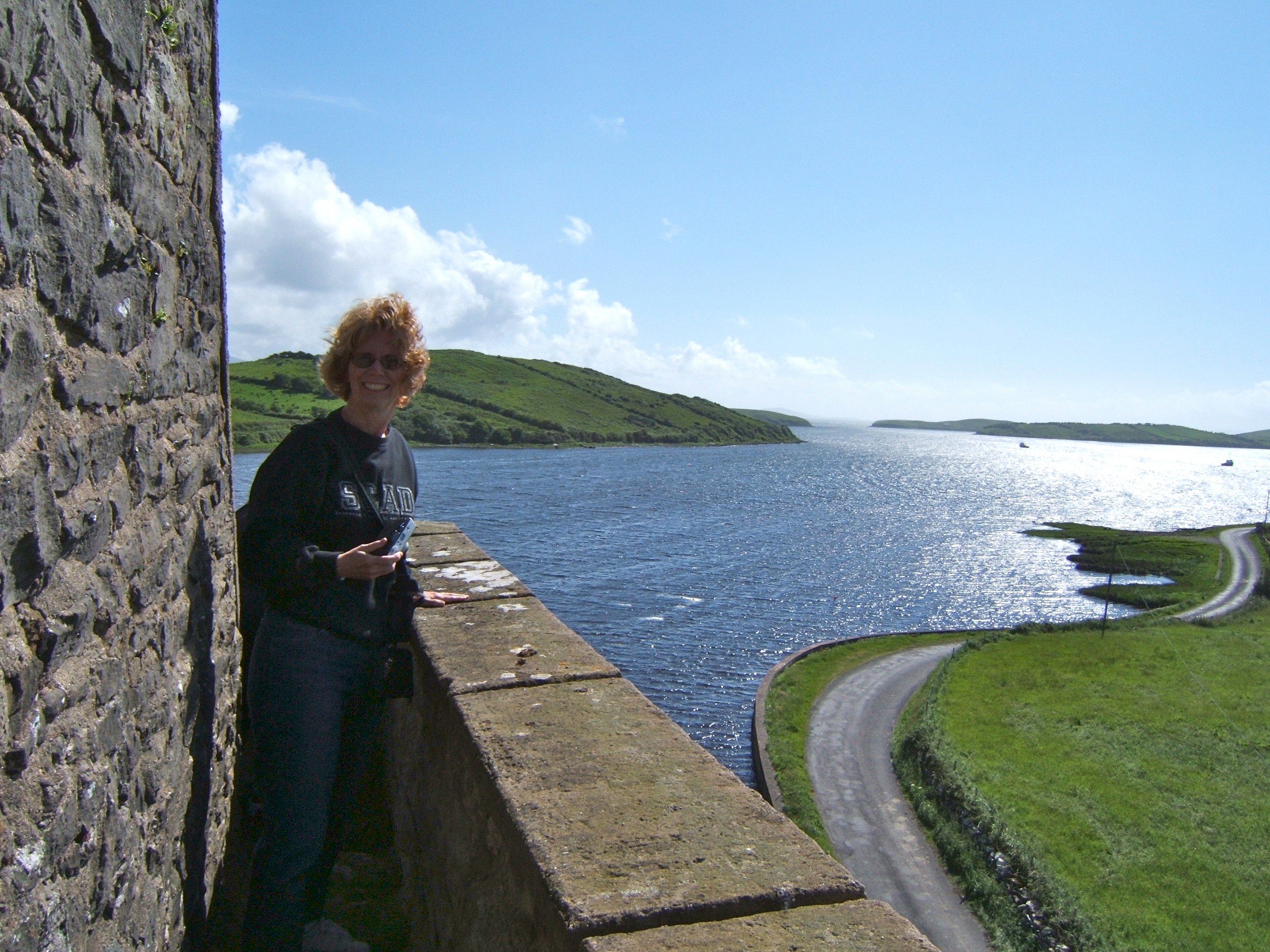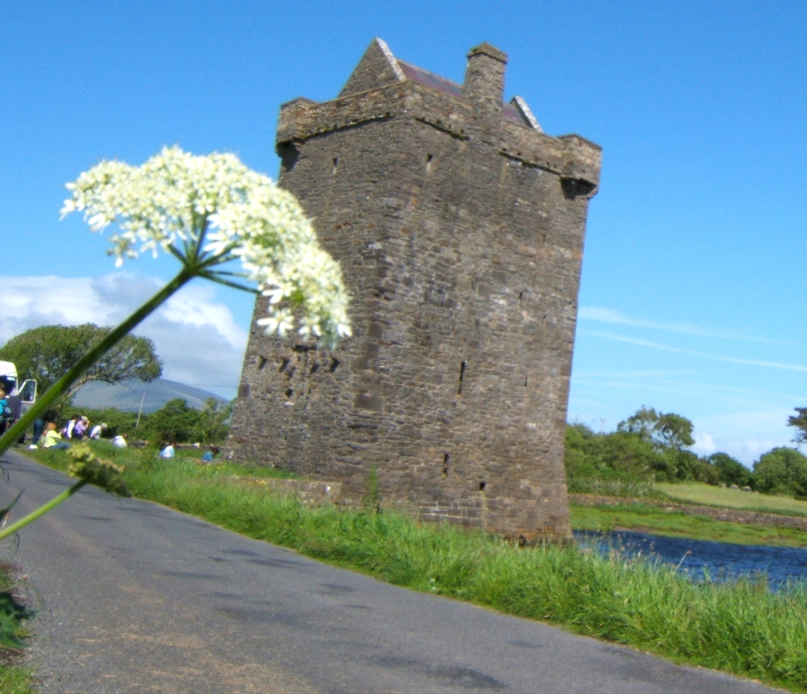 Returned to the train station to join up with our companions and guides to begin the Sierra Club tour. We boarded a van for our first stop at Newport, where Joe McDermott, our guide, escorted us through the town where we became acquainted with our fellow travelers and learned a bit of Irish history. Back on the bus, we toured through the countryside to Rockfleet Castle, the home of the 15th Century pirate queen, Grace Malloy. Because Joe had a key, we were able to enter the tower and climb to the top by narrow, twisting, and steep steps. Light filtered through a few places along the way, but mostly we were climbing in darkness.