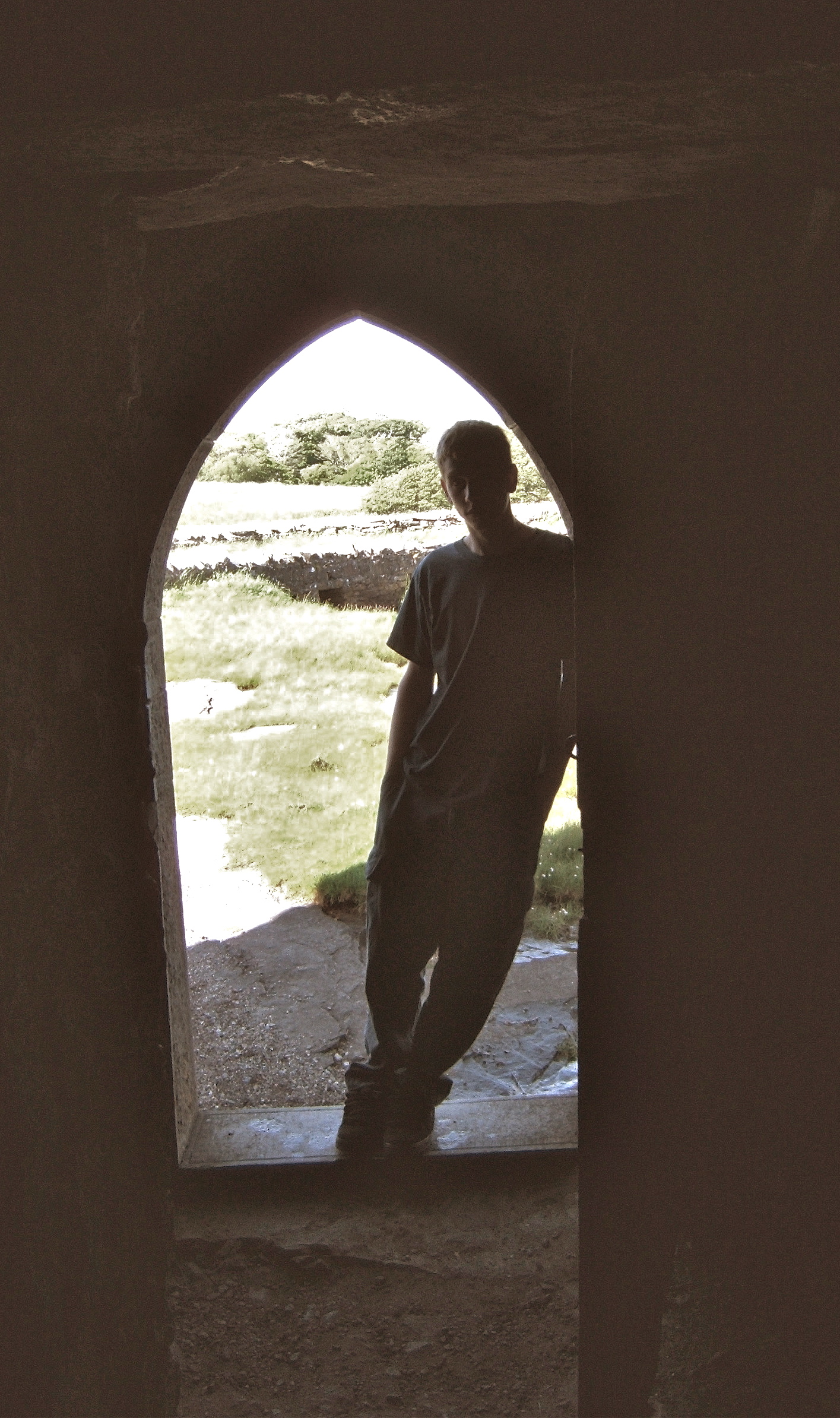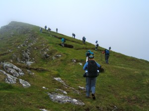 The wind and rain became increasingly intense as we headed up the rocky slope. We couldn’t see anything beyond 20 yards as the summit was completely shrouded in clouds. Maneuvering on the rocks became increasingly painful as feet would slip on the uneven terrain. The walking stick proved indispensable, helping with balance. I concentrated on the trail searching for secure footing–now only the brown rocks before me were important. A feeling of relief came over me as the faint outline of the little white chapel at the summit came into view, and I stepped up the pace to secure the protection its walls might offer only to find the building locked tight. Food and rest, however, offered comfort against the relentless rain, and we ate our sandwiches and talked about the adventure of getting to the top. Frank, an archeologist friend of Joe’s, presented a brief lecture on the chapel and walls, which the Celts constructed. We then packed up for our trip down the other side of the mountain. When I turned the corner away from the church, the wind hit me with such power, it almost knocked me over. The rain and wind tore at my coat as I headed down. Craggy outcroppings of rock distracted me from the storm, as again I focused on my footing. The clouds embraced our group and my fellow hikers disappeared from sight.