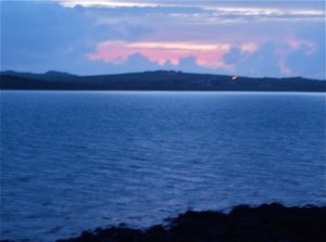 By the time we finished our meal it was still light so Jean and I decided to walk into town. Joe told us that today was St. John’s Day, celebrated by lighting bon fires. The smell of peat hung in the air as we spotted the fires on the far away hills surrounding the village. The local neighborhood had a fire on the beach so we walked toward the flames. The bon fire was burning furiously and children threw seaweed into the fire to hear the “pops”.