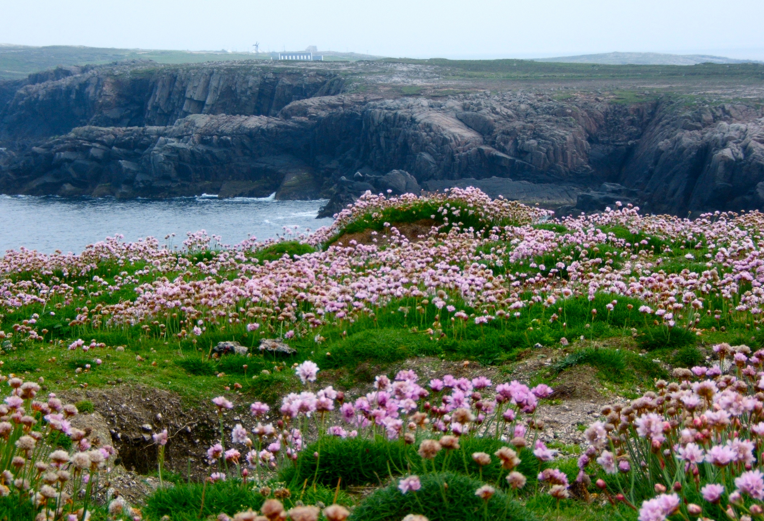 After a light lunch of scones and tea, Joe escorted us on a walk on one side of the island where field flowers lined the pathway to the light house. People have lived on this island for over 4,000 years, with evidence from the stone and iron ages. The government constructed the stone road about a hundred years ago. Along the way we came across a small house, which turned out to be a signal station left from World War II. A pool of water turned out to be a part of a cooling process for the batteries that powered the station. Down from the station rocky cliffs jutted out from the land. Soft grass grew along the ledges and pink wild flowers covered the cliffs. I was tempted to climb down further, but the steepness of the cliffs and the waves crashing below suggested that I stay where I was. We finished our walk back in the village.